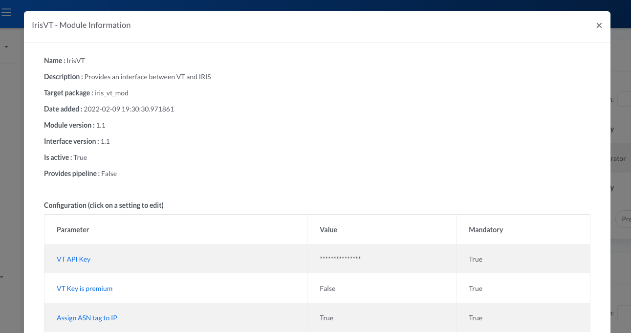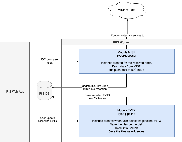 • Processor modules: Allow processing of IRIS data upon predefined actions / hooks. (eg: be notified when a new IOC is created and get VT/MISP insights for it). These are either called automatically upon specific events, or if a user manually triggers them.